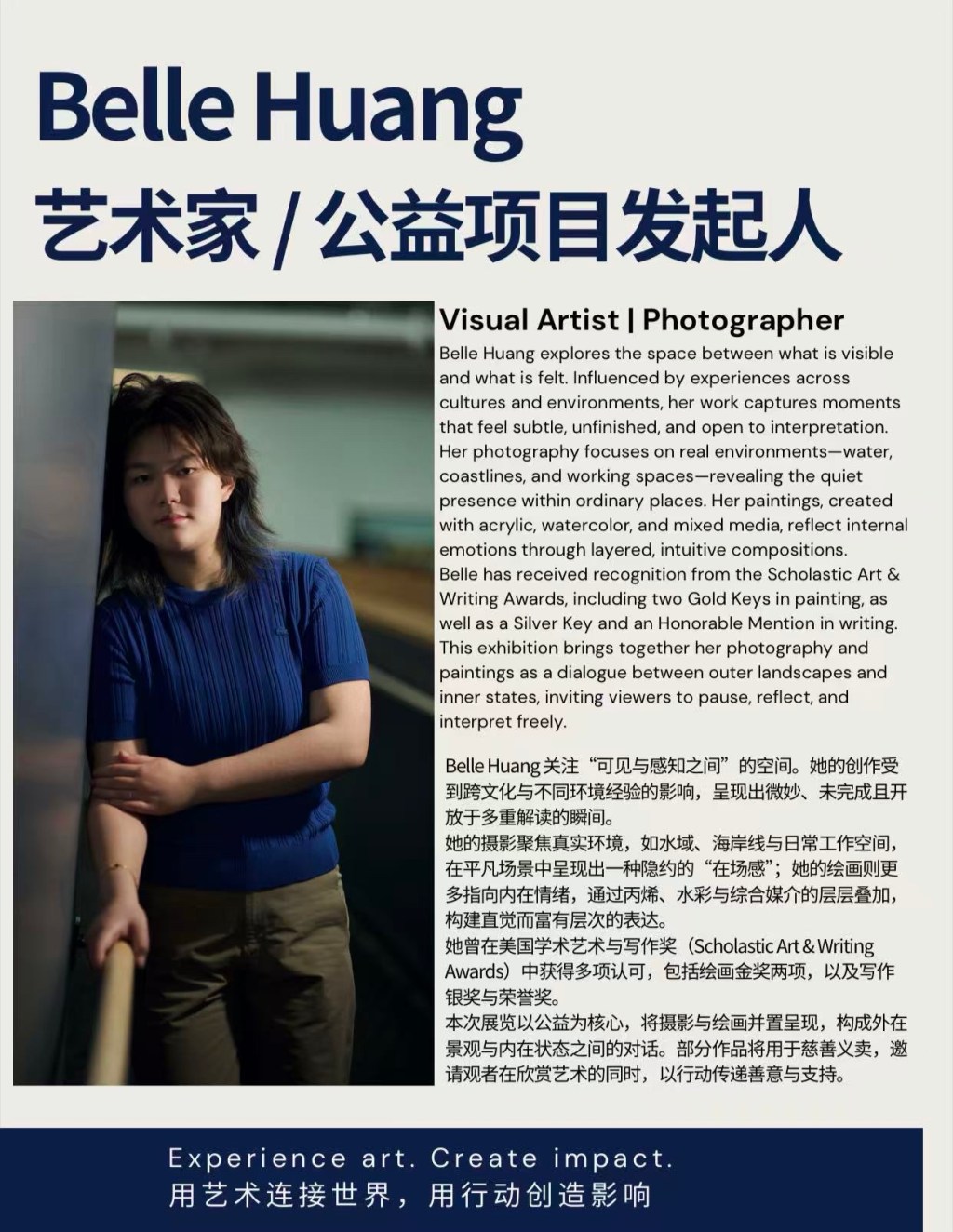与传统学生艺术展不同,本次活动不仅是个人作品展示,更是一次完整的公益项目实践。从策划、组织到执行,Belle Huang以学生身份独立发起并推动整个项目,体现出卓越的领导力与社会责任感。活动将包括艺术与摄影作品展览、公益义卖以及互动艺术体验。通过多元形式,鼓励公众在欣赏艺术的同时参与公益行动,实现“艺术即行动”的理念。