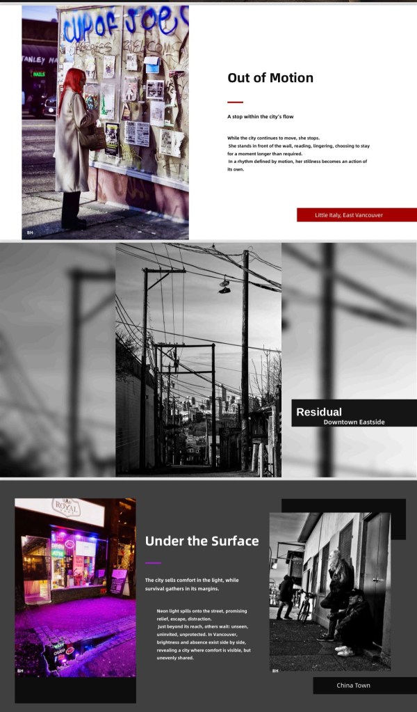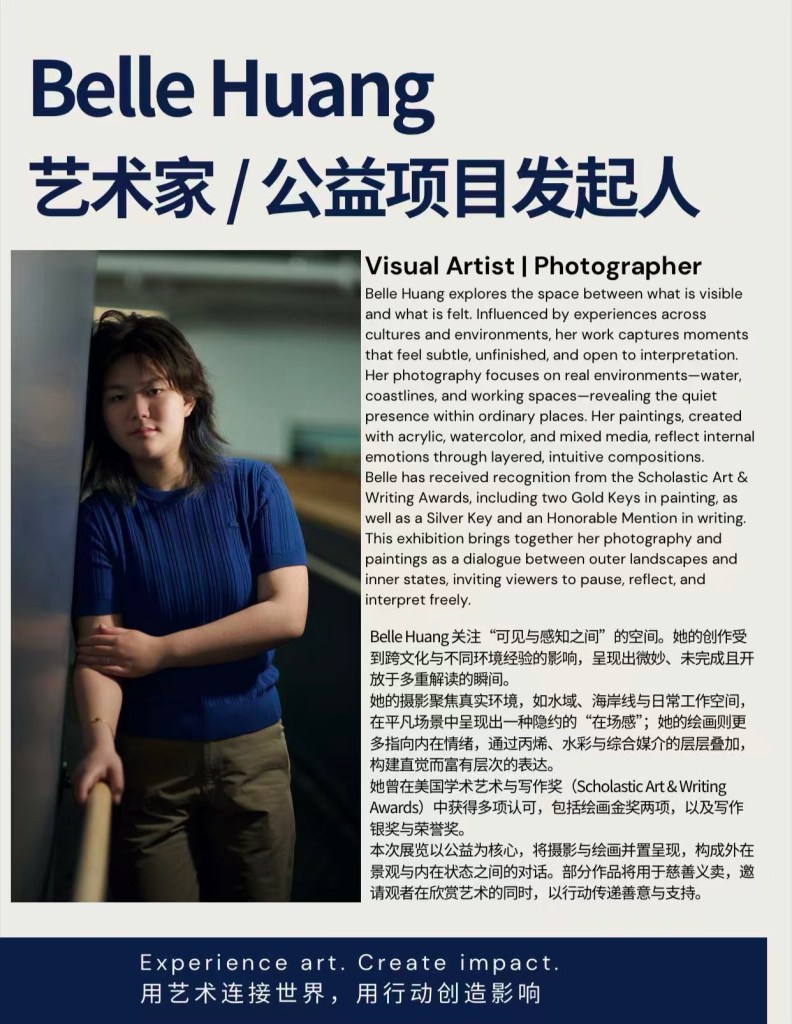 Belle Huang是一名在加拿大就读的高中生,同时也是视觉艺术家与公益项目发起人。她的创作关注“可见与感知之间”的微妙关系,融合摄影与绘画,探索外在环境与内在情绪之间的联系。她的作品灵感来源于跨文化生活体验,摄影多聚焦水域、海岸与日常空间,而绘画则通过丙烯、水彩与综合媒介表达情绪的层次与流动。