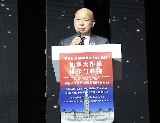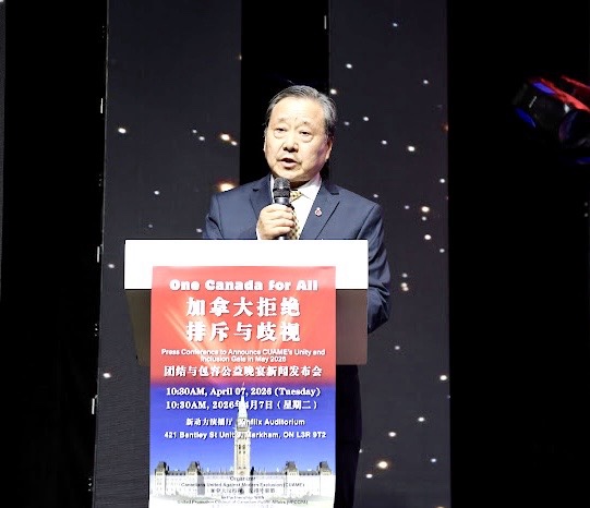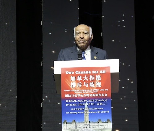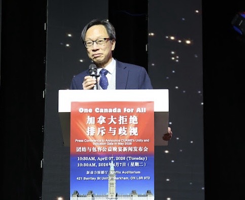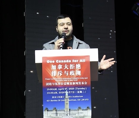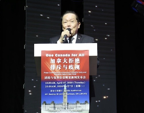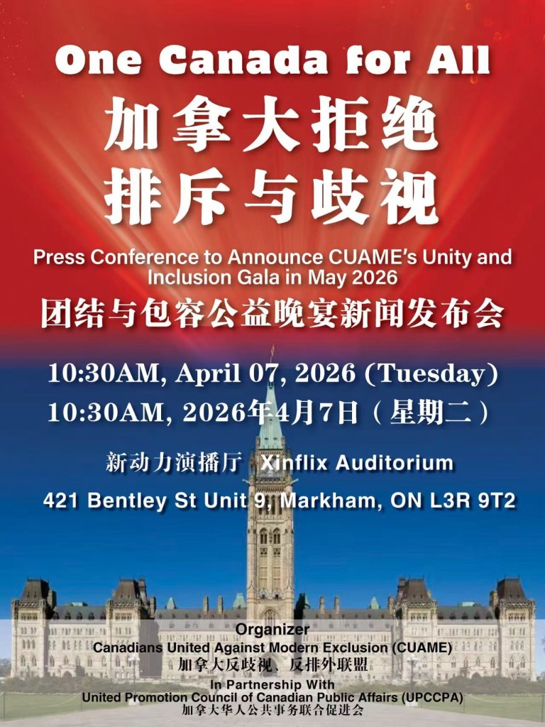 4月7日,由加拿大反歧视、反排外联盟(Canadians United Against Modern Exclusion ,CUAME) 主办、加拿大华人公共事务联合促进会(In Partnership With United Promotion Council of Canadian Public Affairs ,UPCCPA)协办的 “加拿大拒绝排斥与歧视筹款晚宴”(One Canada For All CUAME Unity and Inclusion Fundraising Gala)新闻发布会在万锦市新动力演播厅举行。