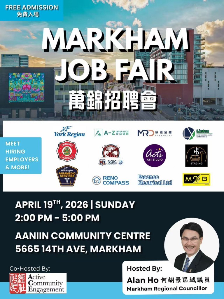 万锦招聘会(Markham Job Fair)于2026年4月19日(星期日)在万锦市的Aaniin Community Centre社区中心成功举办,取得了圆满成功。